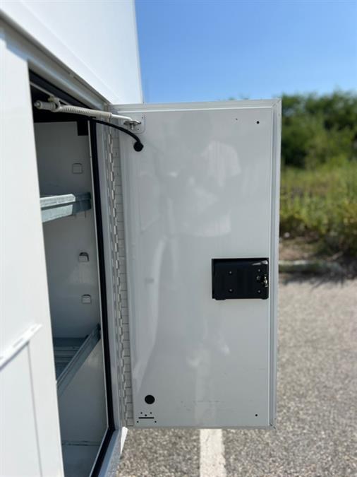 Compartments: Multiple lockable side compartments (both driver and passenger sides) featuring vertically stacked doors with gas-assist struts for easy opening.